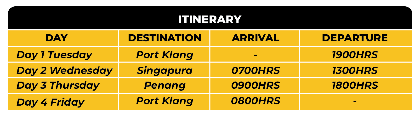 Check in time : 1400HRS Boarding Gate Close : 1700HRS